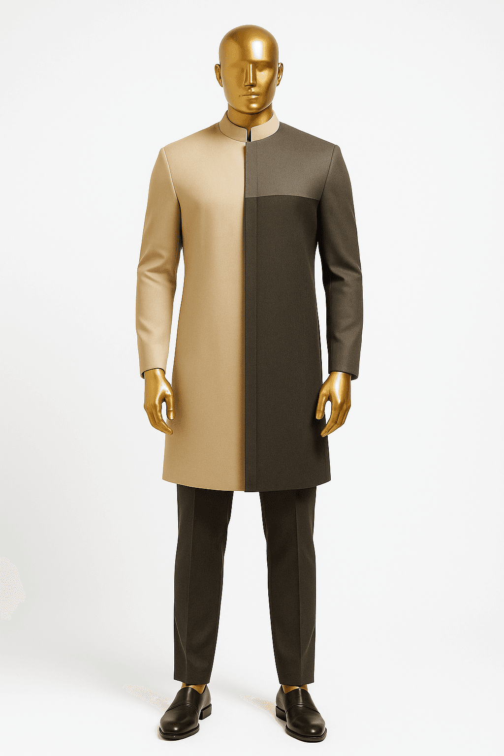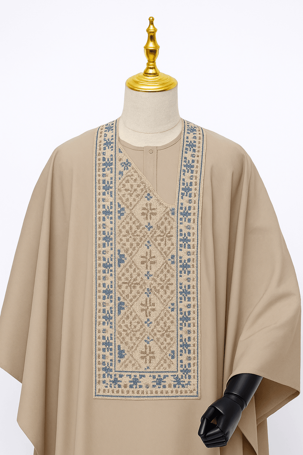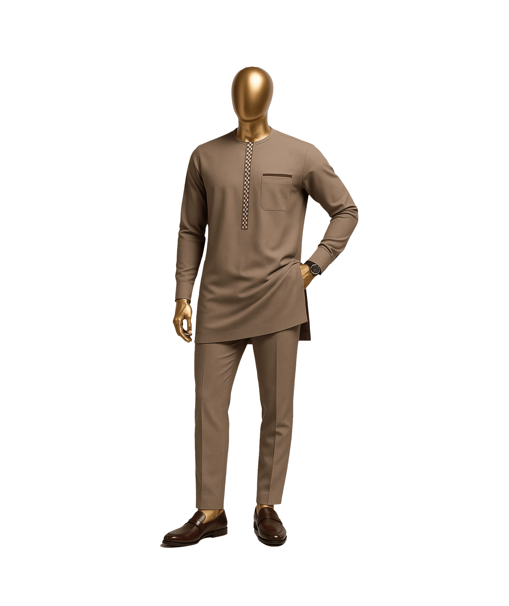 Experience understated elegance with this refined taupe Kaftan featuring delicate embroidery and functional chest pocket. This versatile two-piece set combines neutral sophistication with practical details, perfect for the modern gentleman who appreciates minimalist style and everyday elegance. This polished outfit showcases a long-sleeved Kaftan in warm taupe fabric with subtle embroidered placket detail and functional chest pocket that adds contemporary utility. The round neckline maintains classic proportions while the neutral taupe offers incredible versatility. Paired with matching taupe straight-leg trousers, this two-piece ensemble delivers effortless sophistication for business-casual events, religious services, weekend celebrations, casual upscale gatherings, and everyday traditional wear. The taupe symbolizes groundedness, reliability, and timeless style. Works beautifully across seasons and occasions. Custom-tailored to your exact measurements for comfortable, flattering fit.