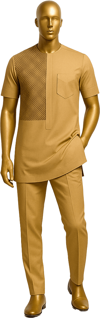 Warm golden-tan short-sleeved kaftan featuring textured diamond-pattern panel on chest. Premium fabric with subtle dimensional detail creating sophisticated depth. Functional chest pocket and clean modern lines. The honeyed gold color radiates warmth and prosperity. Includes matching sokoto. This golden tone evokes abundance, success, and positive energy. The textured panel adds tactile interest without overwhelming embroidery. Perfect for the successful professional honoring culture in contemporary style. Ideal for daytime celebrations, business-cultural events, upscale casual traditional gatherings, anniversary celebrations, or occasions radiating success and warmth.