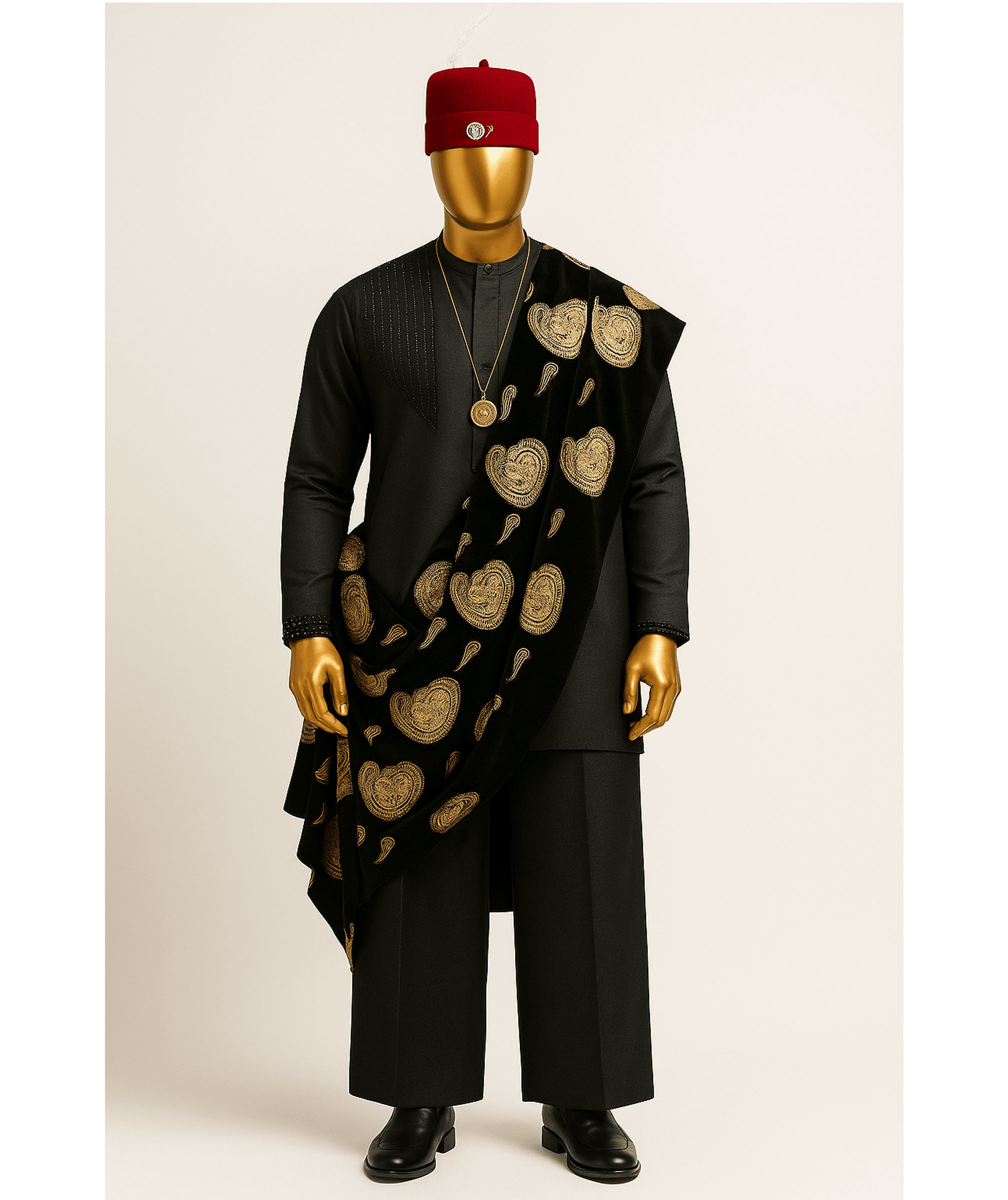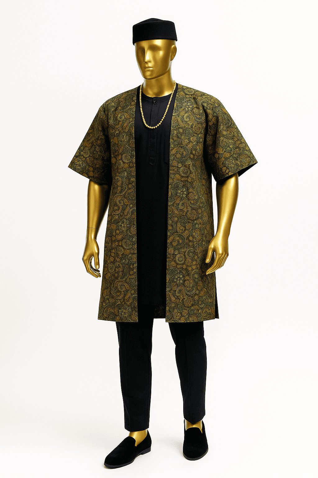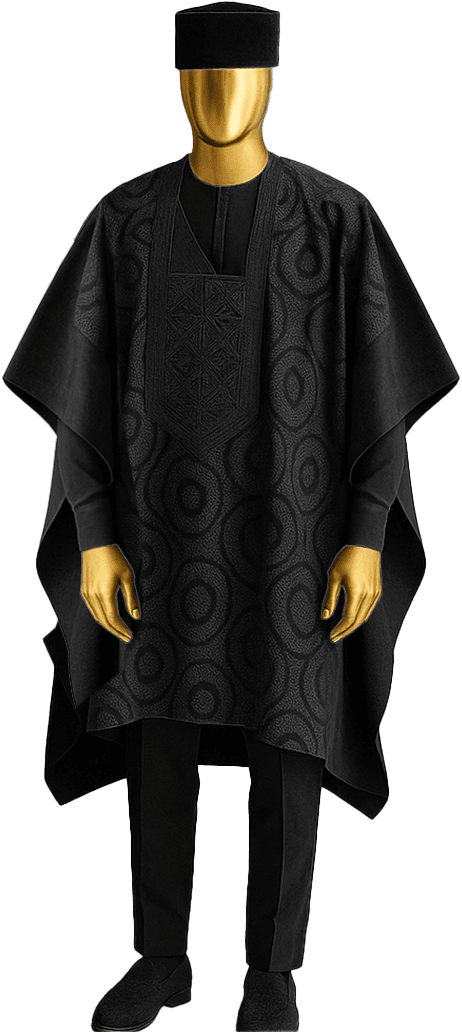 Command powerful presence with this luxurious all-black Agbada ensemble featuring raised damask patterns and dramatic flowing silhouette. This sophisticated three-piece set embodies monochromatic elegance with subtle texture, perfect for the distinguished gentleman who appreciates refined luxury and timeless black-on-black sophistication. This striking outfit showcases a short-sleeved Agbada in premium black fabric with an elaborate raised damask pattern woven throughout, featuring concentric circles and geometric designs that create depth and visual interest through texture rather than color contrast. The traditional wide-sleeve design creates impressive, commanding presence. The all-black aesthetic with textured patterns represents the height of sophisticated restraint and modern elegance. Complete with matching black trousers and a coordinating black Kufi cap, this complete three-piece ensemble delivers powerful style for black-tie weddings, formal evening ceremonies, upscale cultural events, memorial services, and occasions requiring dignified, authoritative presence. The raised damask catches light beautifully, creating subtle shimmer that elevates the monochromatic palette. Custom-tailored to your exact measurements for impeccable fit.