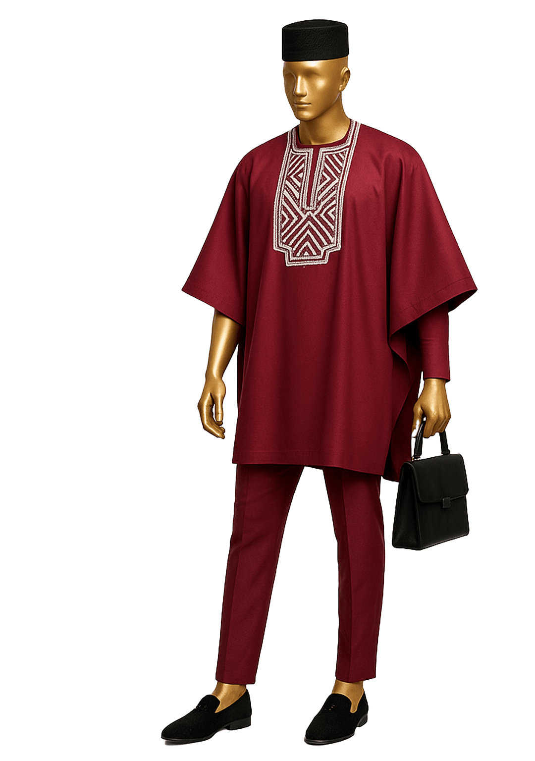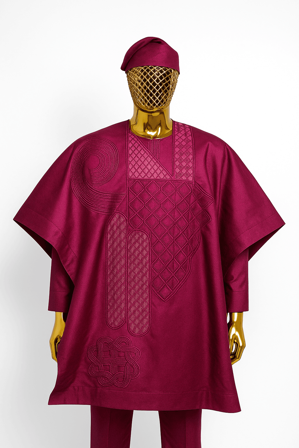 Command attention in this luxurious wine-burgundy Agbada ensemble complete with matching trousers and elaborately wrapped gele (head tie). The short-sleeved flowing robe features stunning white geometric embroidery across the chest panel—intricate diamond and linear patterns that create striking contrast against the rich burgundy fabric. This color represents royalty, power, and spiritual depth across Nigerian cultures, making it ideal for significant life celebrations. The three-piece set offers complete traditional sophistication perfect for upscale weddings, milestone birthdays, and cultural ceremonies. The expert embroidery showcases masterful craftsmanship while the dramatic wine hue ensures you stand out with elegance. The coordinating gele adds authentic cultural flair and completes the regal aesthetic. Pair with gold or black accessories depending on your desired level of formality.