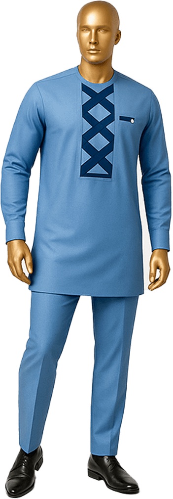 Eye-catching light blue senator suit featuring bold navy blue diamond geometric embroidery down the chest. Crafted in premium fabric with round neckline, striking traditional pattern work, functional chest pocket detail, and long sleeves. Comes with matching trousers for a complete ensemble. The combination of serene sky blue and dramatic navy pattern creates visual interest without overwhelming. The geometric embroidery is both modern and deeply rooted in African design tradition. Perfect for weddings, engagement ceremonies, cultural festivals, upscale parties, or any celebration where you want to blend contemporary style with traditional craftsmanship.