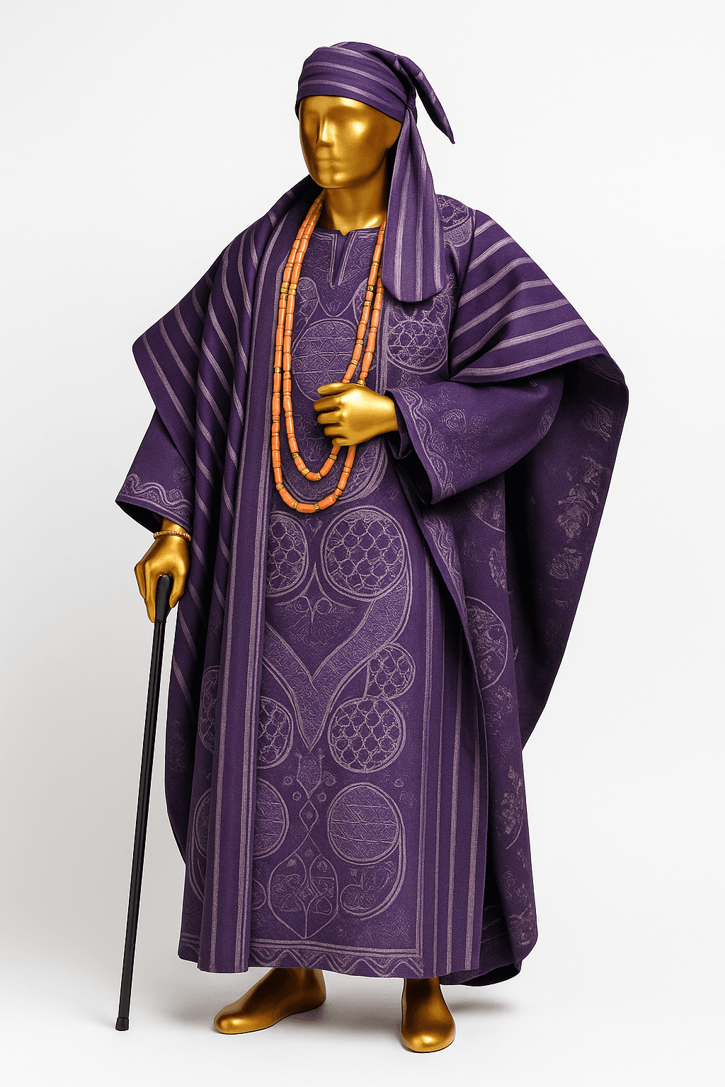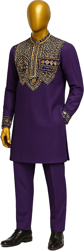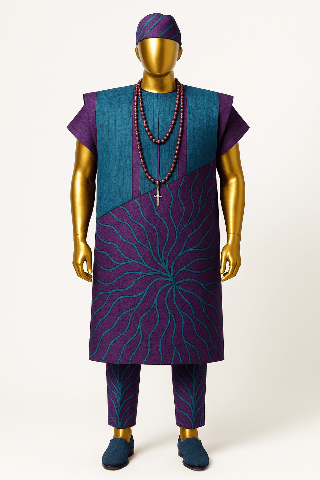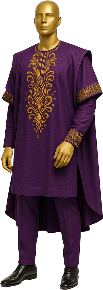 Command respect in this luxurious deep purple Agbada featuring spectacular golden embroidery cascading down the chest and adorning the sleeves. The short-sleeved outer robe flows elegantly over a long-sleeved inner tunic, both showcasing intricate floral and geometric patterns in shimmering golden thread. Paired with matching purple trousers, this three-piece ensemble channels royal authority and spiritual wisdom through its rich color and elaborate embellishment. Perfect for high-ranking title holders, accomplished professionals, and distinguished gentlemen attending chieftaincy ceremonies, traditional weddings, and milestone celebrations. The purple hue represents nobility, spiritual depth, and leadership, while the golden embroidery symbolizes prosperity and divine favor. This is investment dressing for those who understand that true power is expressed through cultural authenticity.