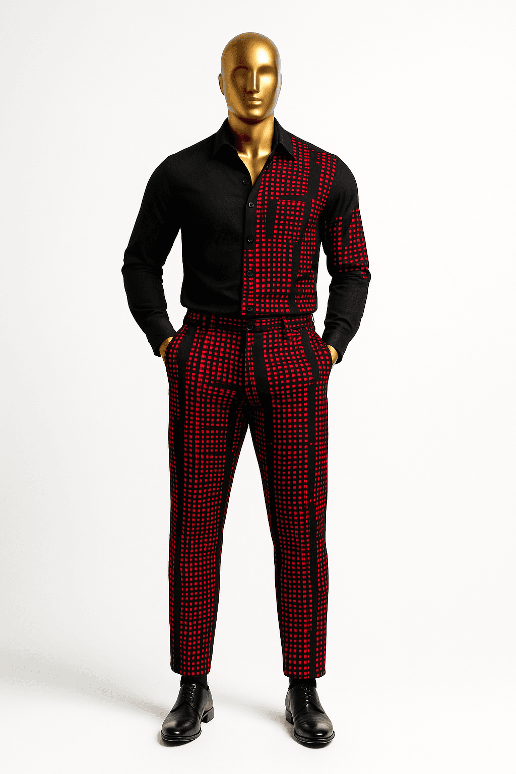 Bold red brocade jacket with large black and gold geometric medallion patterns throughout. The fitted blazer-style cut with long sleeves creates sharp, tailored silhouette. White placket down the center provides contrast while black cuffs add definition. Wear over white shirt and black trousers for maximum impact. This isn't subtle—it's designed to turn heads. The brocade fabric gives luxurious weight and drape while the red and black combination is undeniably powerful. Perfect for performers, creative professionals, and confident dressers who want to make memorable entrances. The jacket styling offers versatility—button it up or wear it open depending on the vibe.
