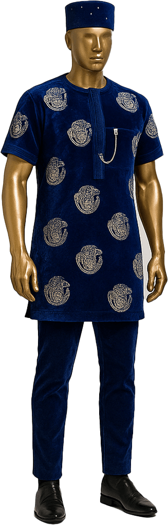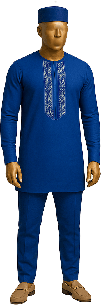 Stunning royal blue senator suit in rich solid fabric with exquisite geometric embroidery cascading down the chest. Features round neckline, intricate traditional threadwork in contrasting tone, and long sleeves for a regal appearance. Complete with matching royal blue cap and coordinating trousers. The deep blue commands attention while the detailed embroidery adds cultural authenticity and craftsmanship. This is statement dressing at its finest—bold color meets traditional artistry. Perfect for weddings, chieftaincy ceremonies, milestone celebrations, Aso Ebi events, or any grand occasion where you want to honor tradition while standing out.