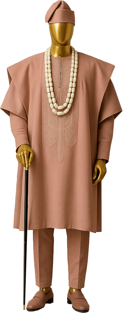 Embrace refined sophistication with this elegant dusty rose Agbada featuring subtle tonal embroidery. This distinguished four-piece set combines soft, sophisticated color with understated detailing, perfect for the gentleman who appreciates muted elegance and contemporary style. This graceful outfit showcases a short-sleeved Agbada in soft dusty rose fabric, adorned with delicate tonal embroidery creating texture without visual overwhelm. Styled with layered cream coral beads that add traditional elegance and complement the soft rose tone beautifully. The traditional wide-sleeve design creates impressive yet gentle presence. Complete with matching dusty rose trousers in varied tones, inner long-sleeved top, and a coordinating rose-brown Kufi cap, this complete ensemble delivers sophisticated warmth for spring weddings, daytime celebrations, contemporary cultural events, and occasions requiring soft, distinguished elegance. The dusty rose symbolizes grace, refinement, and modern masculinity. Custom-tailored to your exact measurements with traditional walking stick completing the regal look.