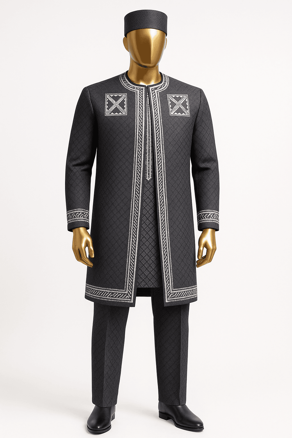Sophisticated charcoal long kaftan featuring subtle tonal embroidered chest panel. The flowing design showcases delicate embroidery in matching gray tones creating understated texture and dimension. Round neckline with refined styling and long sleeves offer elegant coverage. Paired with coordinating charcoal trousers and matching traditional cap for complete ensemble. Made from premium solid fabric with expert tone-on-tone embroidery work. The monochromatic palette exudes quiet luxury and refined taste. Understated embellishment maintains contemporary appeal while honoring traditional craftsmanship. Ideal for formal ceremonies, business-formal events, religious services, sophisticated gatherings, or refined everyday elegance.