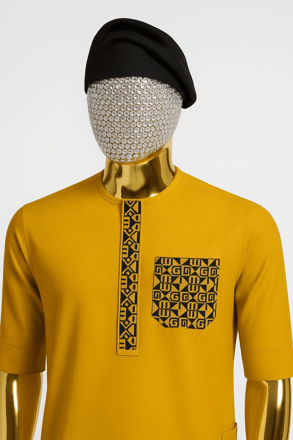 Stand out in this vibrant golden yellow short-sleeved dashiki featuring bold black geometric embroidery on the chest pocket and placket. The bright yellow fabric makes a confident statement while the contrasting black embroidery adds graphic appeal. Complete with matching black cap for a coordinated look. This piece works beautifully for daytime events and celebrations where bold color is welcome. The fitted silhouette offers modern appeal while the embroidered details maintain traditional aesthetics. Pair with black or khaki trousers for versatile styling options.