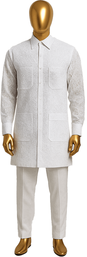 Pristine white long-sleeved senator crafted from luxurious damask fabric with subtle jacquard pattern throughout. The elegant woven texture creates dimensional design in pure white tones. Classic shirt collar with full button placket and chest pockets add refined tailoring details. Paired with coordinating white trousers for immaculate monochromatic elegance. Made from premium damask fabric with intricate woven detailing and quality construction. The pure white palette symbolizes purity and sophistication. Textured fabric adds visual interest while maintaining clean aesthetic. Perfect for formal ceremonies, religious events, milestone celebrations, dignified occasions, sophisticated gatherings, or pristine elegant styling.
