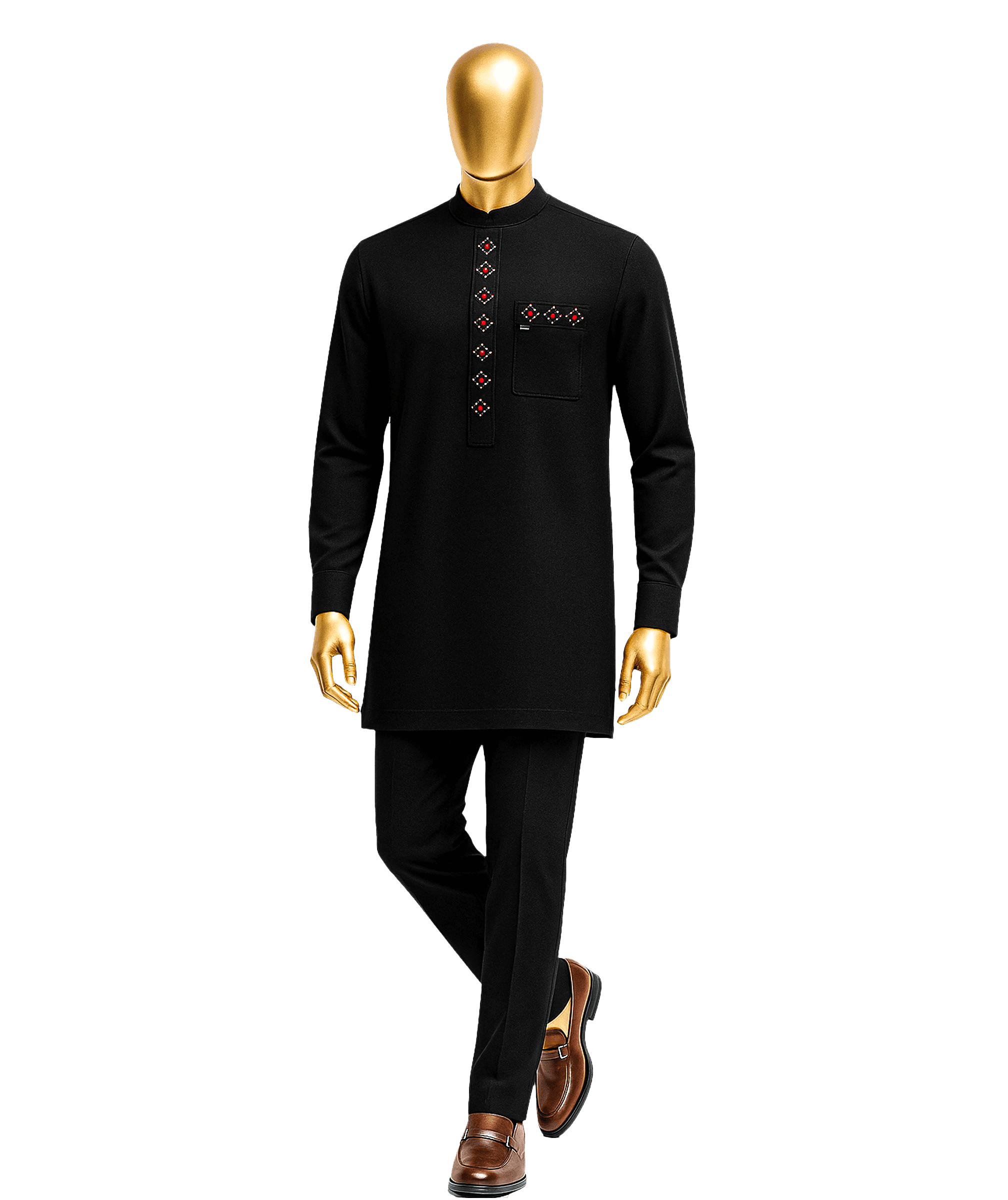Experience contemporary sophistication with this sleek all-black Kaftan featuring vibrant multicolor embroidered accents. This refined two-piece set combines monochromatic elegance with jewel-toned detailing, perfect for the fashion-forward gentleman who appreciates subtle pops of color. This modern outfit showcases a long-sleeved Kaftan in premium black fabric, adorned with delicate multicolor embroidered diamond motifs in jewel tones (emerald, ruby, sapphire) arranged vertically on the placket and scattered on the chest. The vibrant threadwork creates subtle visual interest against the black base. The mandarin collar maintains classic proportions. Paired with matching black straight-leg trousers, this two-piece ensemble delivers versatile elegance for contemporary cultural events, upscale gatherings, fashion-forward occasions, and everyday refined traditional wear. The black base with jewel accents conveys modern sophistication with personality. Custom-tailored to your exact measurements.