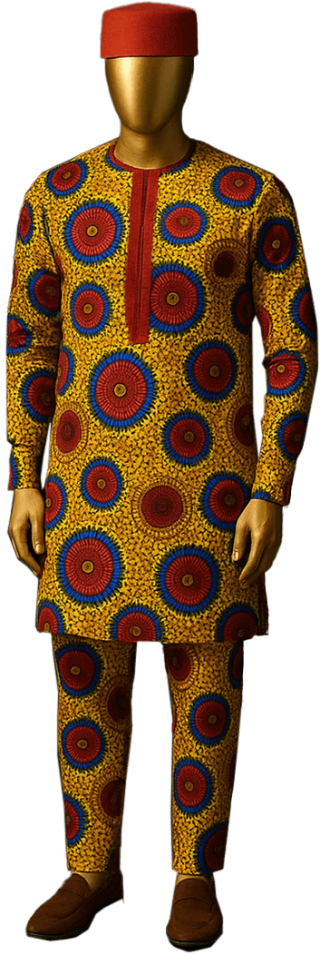 Celebrate African vibrancy with this dazzling golden yellow Ankara Senator ensemble featuring bold circular medallion patterns. This eye-catching three-piece set is designed for the charismatic gentleman who isn't afraid to embrace color, culture, and joy in his wardrobe. The outfit showcases a long-sleeved Senator top in brilliant yellow African print fabric adorned with striking concentric circle patterns in red, blue, and brown. The energetic design radiates warmth and cultural pride. The round neckline and knee-length cut maintain traditional elegance while the bold print makes a contemporary statement. Paired with full matching trousers and a coordinating red traditional cap (Fez), this complete ensemble delivers maximum visual impact.