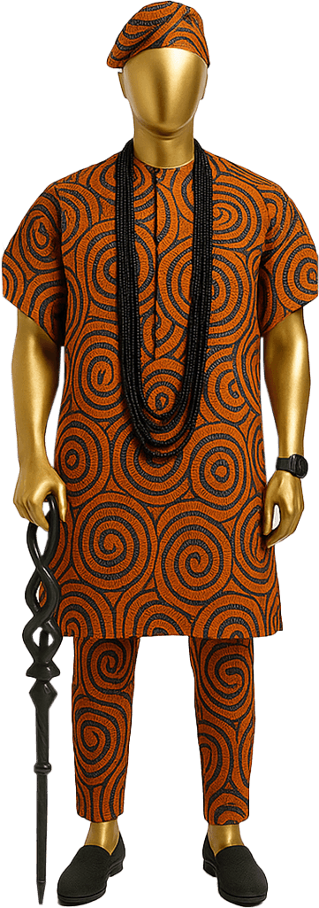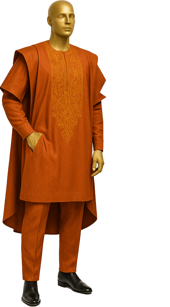 Step into cultural royalty with this striking terracotta orange Agbada ensemble featuring exquisite tonal embroidery down the chest panel. The flowing short-sleeved outer robe drapes majestically over a fitted long-sleeved inner tunic, creating the classic layered silhouette that defines traditional Nigerian ceremonial wear. The intricate embroidery showcases ancient Yoruba geometric patterns symbolizing prosperity and ancestral blessings, while the rich orange hue represents vitality, creativity, and the sacred earth of our homeland.This three-piece set—outer Agbada, inner tunic, and tailored trousers—embodies timeless sophistication perfect for weddings, chieftaincy ceremonies, and milestone celebrations. The premium fabric offers breathable comfort during extended celebrations while maintaining its regal drape. Style with black leather footwear for classic elegance or brown accessories for warmth. This ensemble bridges heritage and modernity with effortless grace.