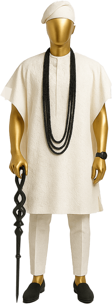 Pristine cream short-sleeved kaftan in premium solid fabric with clean elegant lines. Simple refined silhouette creates timeless sophistication and ceremonial dignity. Styled with coordinating cream trousers, cream traditional cap, layered black beaded necklaces, and ceremonial staff for complete elder's presentation. Made from quality solid cream fabric with smooth luxurious finish. The pure cream palette represents wisdom, peace, and spiritual significance. Minimal embellishment keeps focus on the ceremonial accessories and dignified presence. Perfect for traditional ceremonies, spiritual events, cultural leadership occasions, elder's gatherings, religious services, or symbolic meaningful presentations.