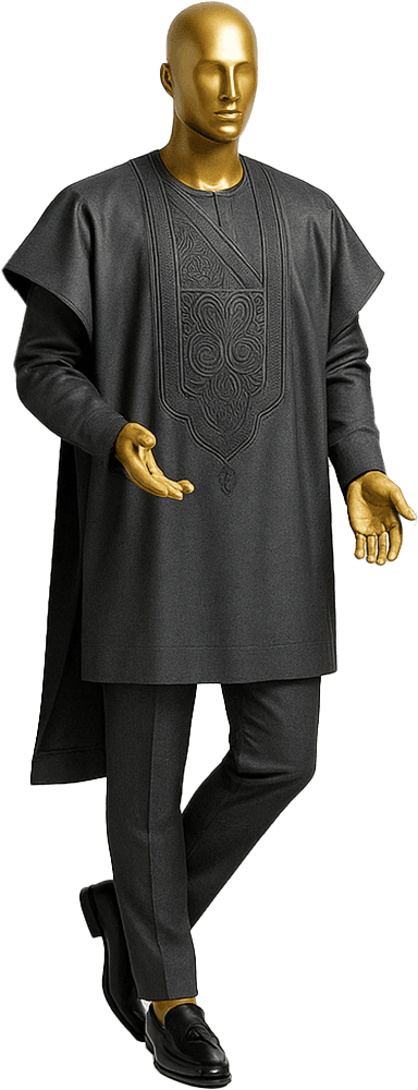 Refined charcoal gray complete agbada ensemble with tonal embroidery creating subtle sophistication. The flowing outer robe features wide sleeves and generous drape in premium solid fabric. Delicate tonal embroidery adorns the chest adding texture without bold contrast. Fitted short-sleeved inner top layers beneath the voluminous agbada. Coordinating charcoal trousers complete the monochromatic look. The understated gray tone offers versatile elegance that works across occasions. Subtle embellishment maintains focus on the luxurious fabric drape and tailored construction. Perfect for business-formal events, dignified ceremonies, leadership occasions, sophisticated celebrations, or anytime refined understatement is preferred.