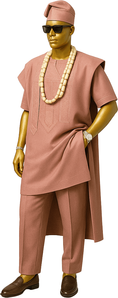 Beautiful dusty rose agbada ensemble in premium solid fabric with short sleeves and flowing outer robe. Features traditional side panels and layered construction. Complete with matching rose cap, elegant cream/coral beads for authentic ceremonial presentation. Includes coordinating inner buba and sokoto. The warm rose tone is both unexpected and sophisticated—offering a refreshing alternative to typical colors. The complete agbada structure honors tradition while the color palette brings modern sensibility. Perfect for daytime weddings, cultural celebrations, family milestone events, upscale traditional gatherings, or occasions calling for distinguished traditional elegance with personality.