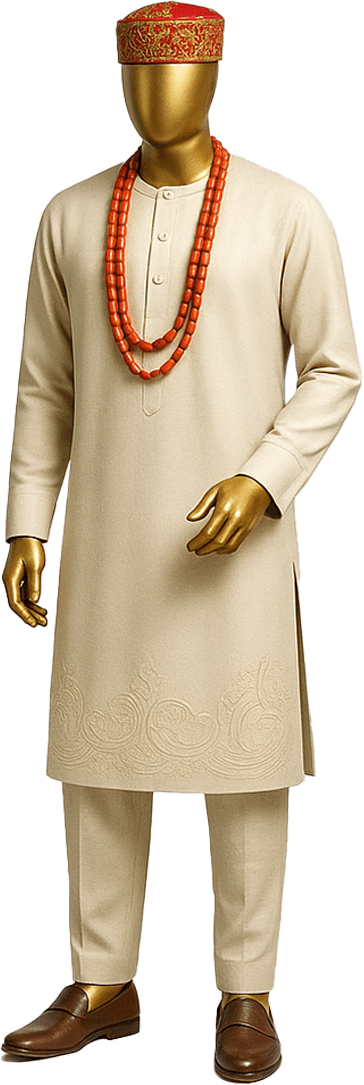 Elegant cream long-sleeved senator set featuring subtle tonal embroidery along the hemline. Clean, streamlined silhouette with refined mandarin collar and classic button placket. The long top offers modest coverage with sophisticated styling. Delicate embroidered detailing at the bottom adds understated embellishment without overwhelming the design. Paired with matching cream trousers for complete monochromatic elegance. Styled with vibrant coral beaded necklaces and matching embroidered traditional cap for authentic finishing touches. Made from quality solid fabric with smooth finish. Perfect for traditional ceremonies, cultural events, religious celebrations, milestone occasions, or anytime refined simplicity is desired.