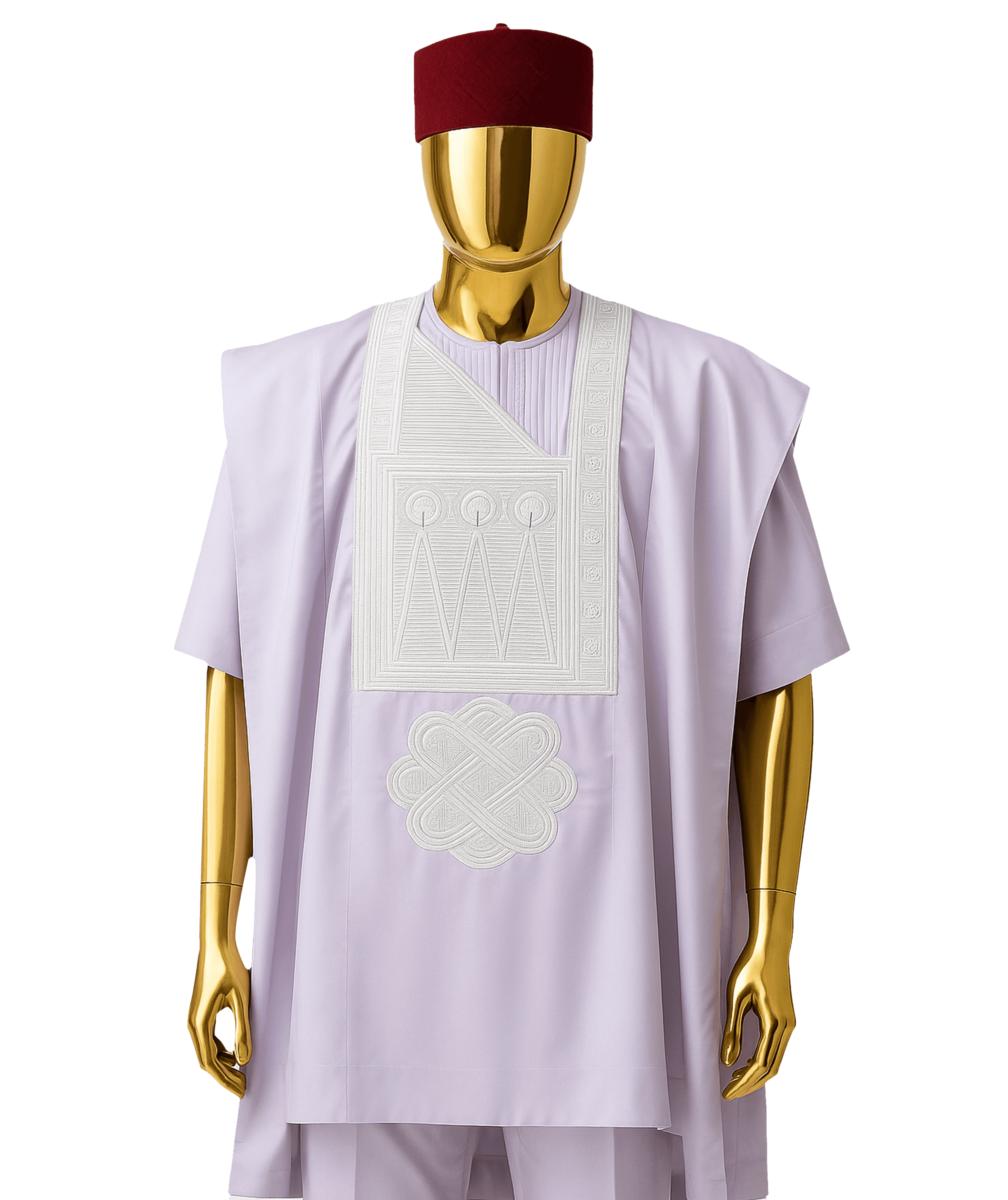 This soft lavender short-sleeved Agbada showcases intricate white embroidery featuring geometric patterns and knotwork down the chest. The pastel purple fabric creates gentle, approachable presentation while the detailed white needlework adds dimension. Complete with burgundy cap for striking color contrast, this ensemble balances soft and bold tones. The flowing silhouette offers comfort while maintaining refined appearance. The lavender and burgundy combination creates unexpected yet sophisticated color pairing. Pair with white or black trousers for versatile styling options.