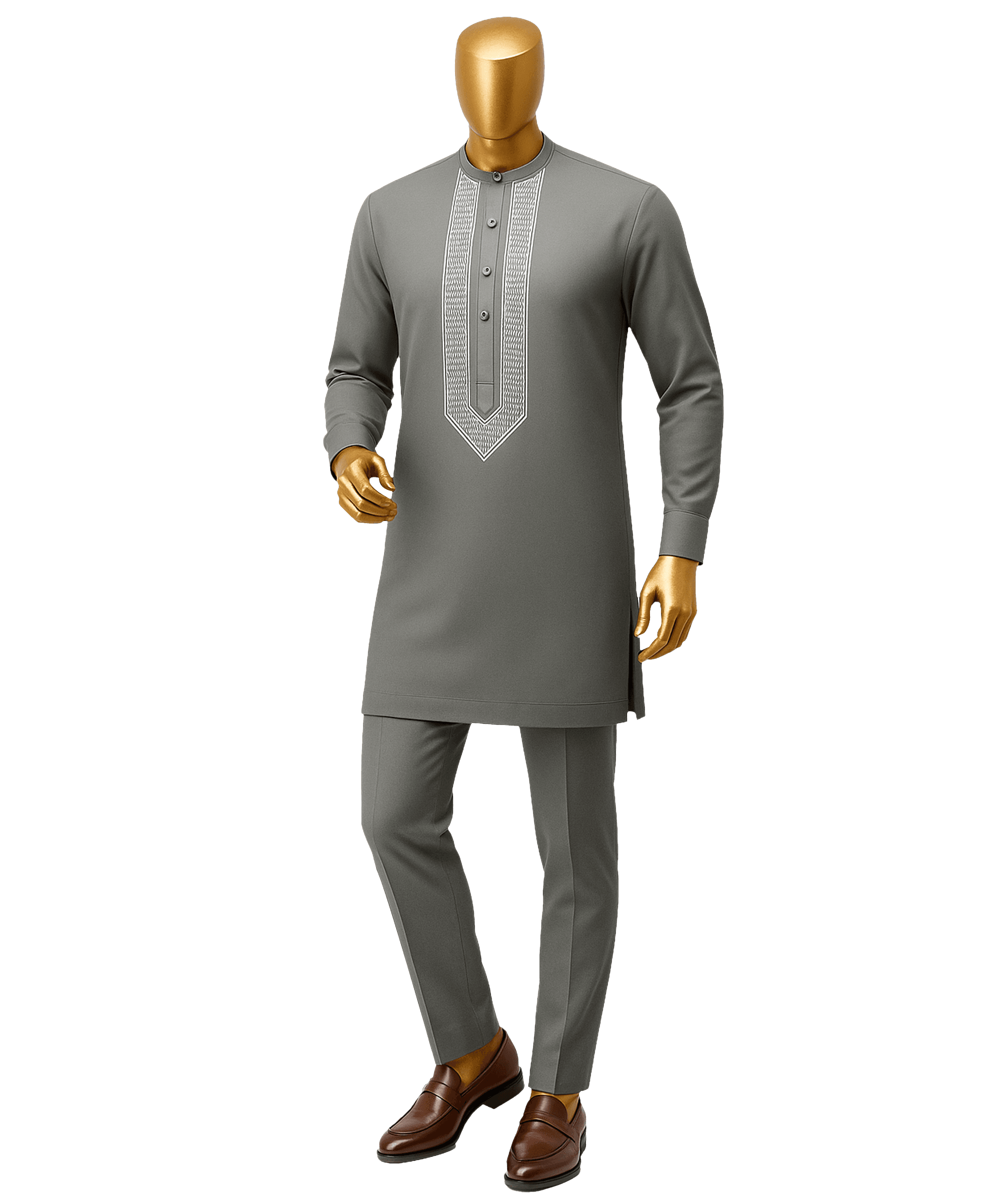 Embrace refined elegance with this sophisticated grey Senator suit, a contemporary take on Nigerian formal wear. This tailored two-piece features intricate white embroidered detailing along the chest panel, creating a striking contrast against the cool grey fabric. The mandarin collar and fitted silhouette offer a modern edge while honoring traditional craftsmanship. Perfect for weddings, corporate events, and cultural celebrations where you want to make a distinguished impression.