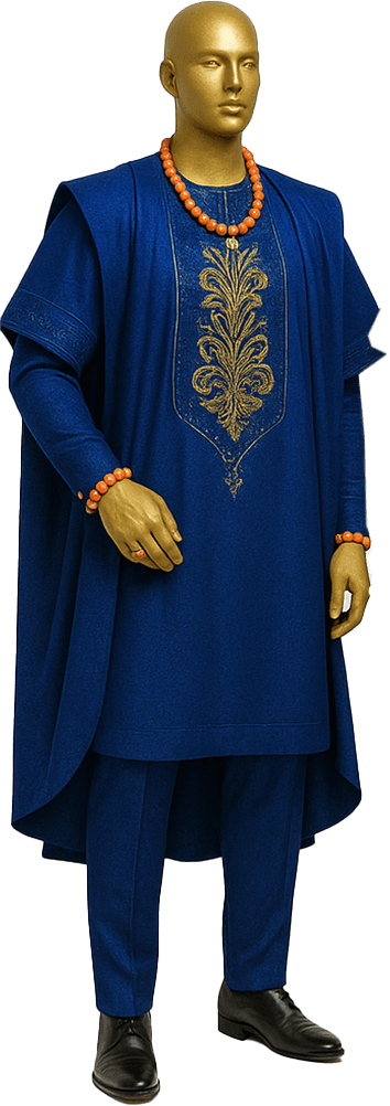 Experience majestic elegance with this spectacular royal blue Agbada featuring stunning gold leaf embroidery and dramatic styling. This luxurious three-piece set combines vibrant blue with ornate metallic detailing, perfect for the gentleman who appreciates bold color and elaborate craftsmanship. This impressive outfit showcases a short-sleeved Agbada in vibrant royal blue fabric, elevated by magnificent gold embroidered botanical leaf designs cascading down the chest in an elegant vertical arrangement. Orange coral beads add traditional cultural accent around the neckline. The traditional wide-sleeve design with dramatic high-low hemline creates commanding presence and modern edge. Complete with matching royal blue trousers, this three-piece ensemble delivers powerful sophistication for high-profile weddings, chieftaincy installations, cultural celebrations, and prestigious events where you want to make an unforgettable statement. The royal blue symbolizes nobility and confidence. Custom-tailored to your exact measurements.