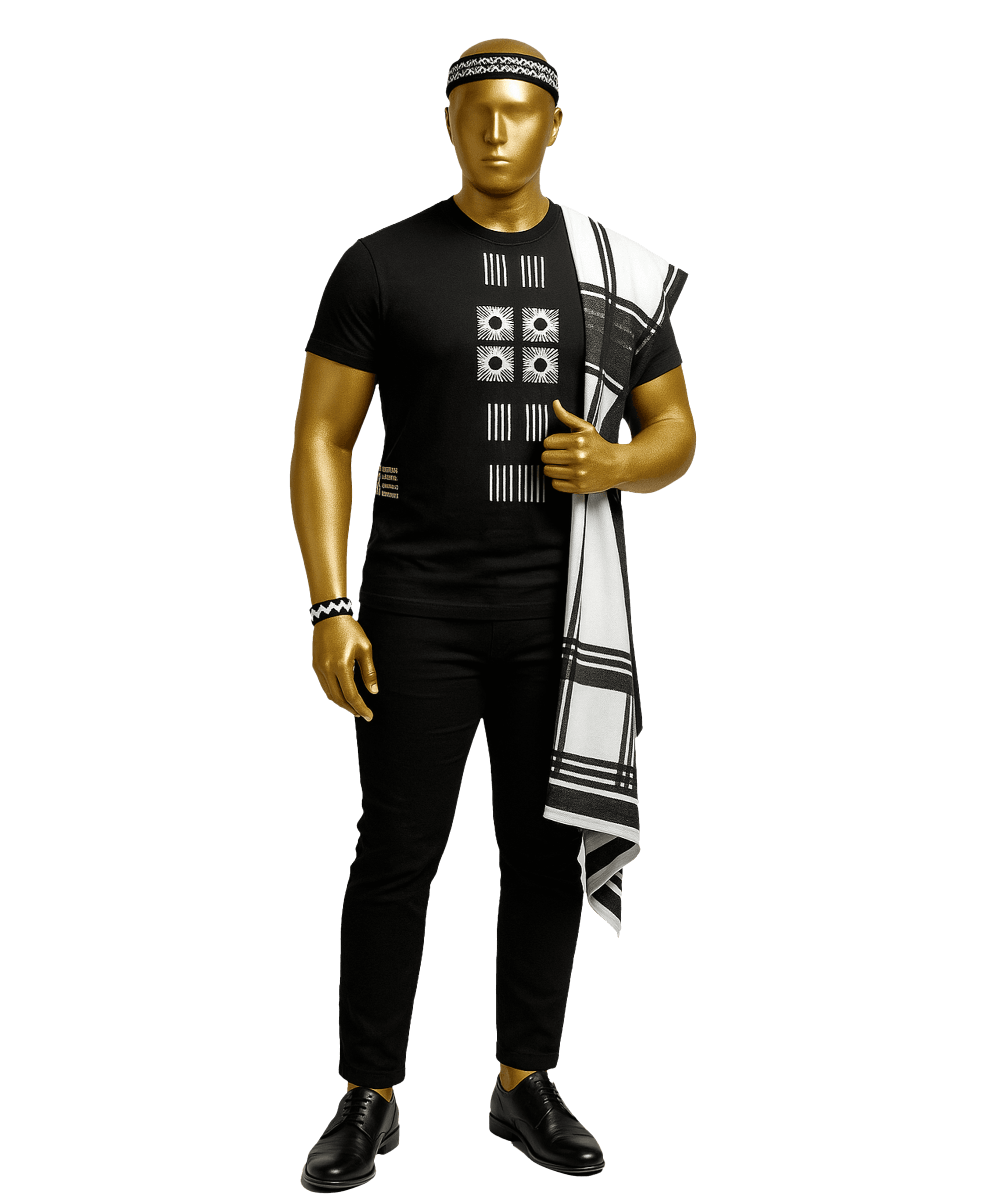 Experience cultural fusion at its finest with this contemporary black t-shirt ensemble featuring bold white geometric tribal prints and traditional wrapper. The short-sleeved shirt showcases Nsibidi-inspired symbols—ancient Nigerian ideographic writing—creating a powerful visual statement that connects modern urban style with ancestral wisdom. The fitted silhouette offers contemporary appeal while the symbolic patterns honor indigenous artistry. Paired with a coordinating wrapper featuring complementary geometric patterns and matching headband, this ensemble redefines what traditional wear can be in the modern era. Perfect for the culturally conscious individual who moves seamlessly between worlds—honoring heritage while embracing innovation. This set works beautifully for cultural festivals, art exhibitions, creative gatherings, and community celebrations where expressing identity through fashion matters. The black and white palette offers versatility and bold contrast, making the ancient symbols pop with contemporary energy. The comfortable cotton construction ensures all-day wearability, while the unique design guarantees you'll stand out from conventional traditional wear. This is heritage reimagined for the next generation—proving tradition and innovation aren't opposites but partners.