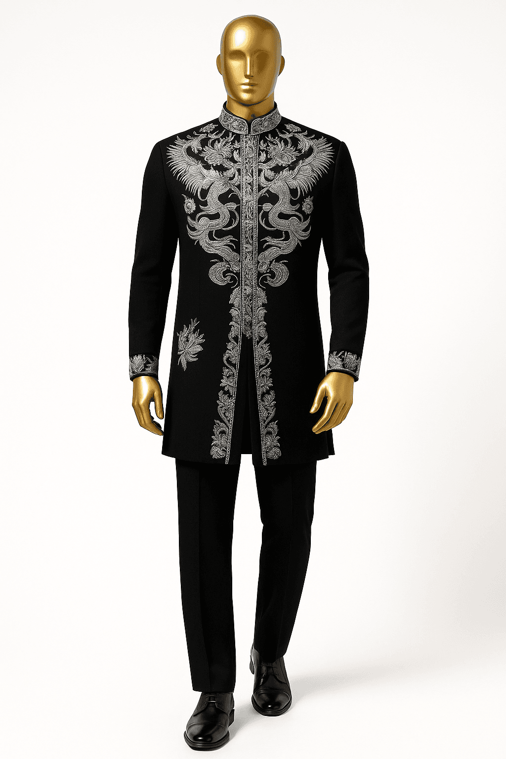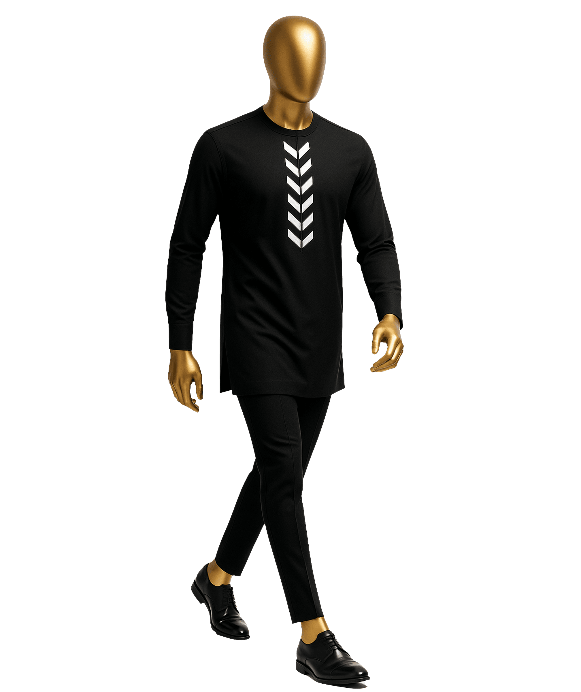 This sleek all-black long-sleeved tunic features bold white leaf or chevron embroidery pattern down the center chest. The contemporary graphic design creates striking contrast against the black fabric. Paired with matching black trousers for streamlined two-piece presentation. The modern embroidery pattern offers fresh take on traditional styling. The fitted long-sleeved silhouette creates clean, polished look perfect for urban professionals. The black and white palette ensures versatile styling across occasions.