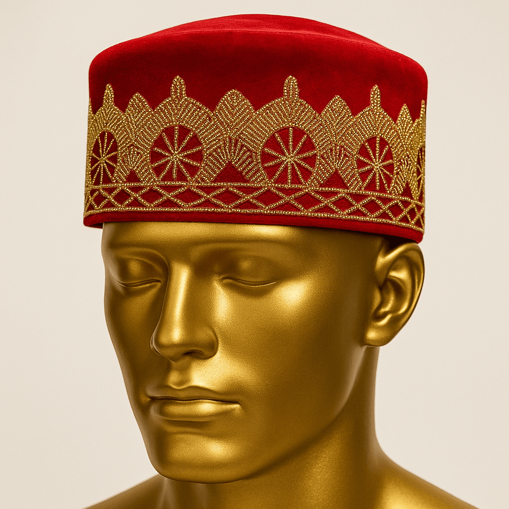 Complete your royal presentation with this stunning bright red velvet cap adorned with intricate golden embroidered band. Multiple rows of geometric patterns including stars, sunbursts, and botanical elements create a crown worthy of traditional rulers. The vibrant red symbolizes life force, courage, and the vital energy of leadership, while the elaborate golden embroidery represents achievement, prosperity, and divine blessing. Perfect for title holders, cultural leaders, and distinguished gentlemen attending the most prestigious traditional ceremonies. This crown carries deep cultural significance—each embroidered element connects to Nigerian royal symbolism and ancestral authority. The structured fit ensures comfortable wear throughout extended ceremonies while maintaining its commanding regal shape.