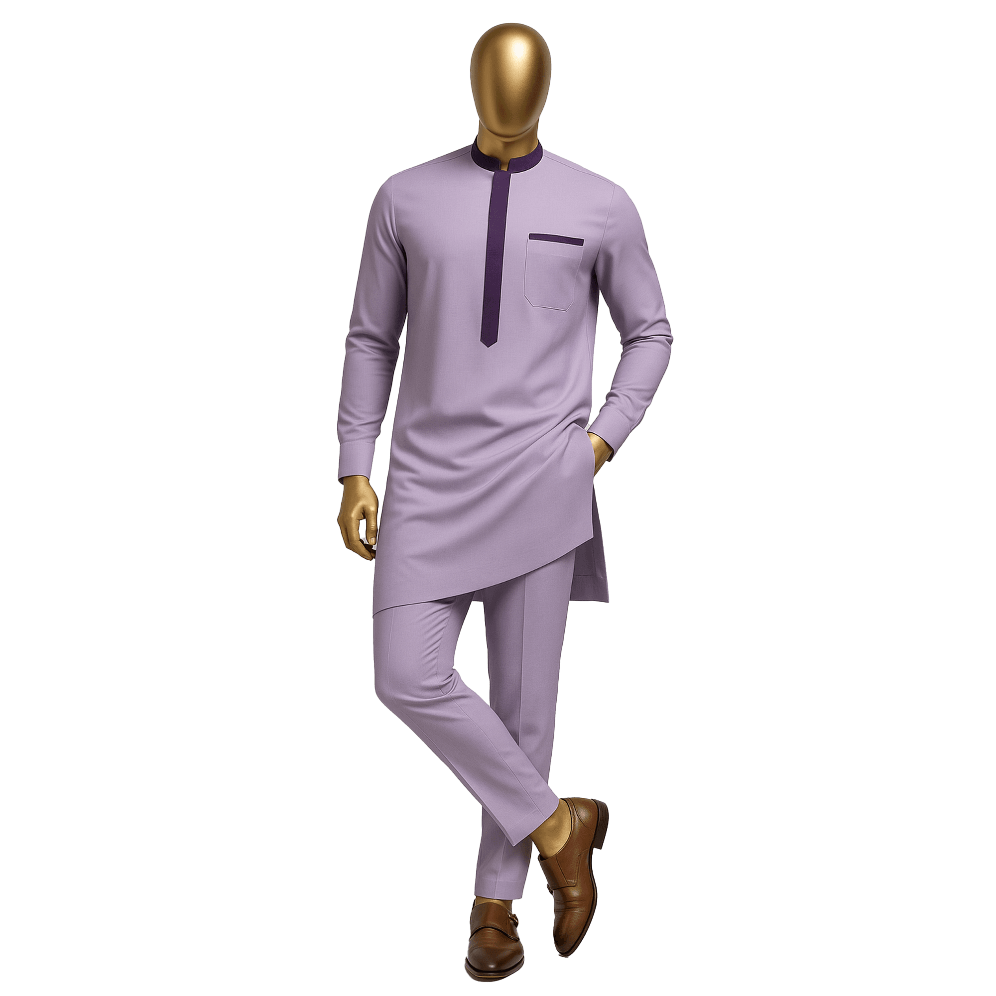 Embrace modern sophistication with this elegant lavender purple Kaftan featuring contrasting navy trim. This contemporary two-piece set combines soft color with bold accents, perfect for the fashion-forward gentleman who appreciates color-blocking and modern style. This stylish outfit showcases a long-sleeved Kaftan in soft lavender purple fabric, elevated by contrasting deep navy blue trim on the mandarin collar, placket, and chest pocket. The color-blocking creates contemporary visual interest while maintaining clean lines. Paired with matching lavender straight-leg trousers, this two-piece ensemble delivers fresh, modern elegance for contemporary weddings, fashion-forward cultural events, spring celebrations, creative gatherings, and occasions requiring distinctive, confident style. The lavender symbolizes creativity, individuality, and modern masculinity. Custom-tailored to your exact measurements for comfortable fit.