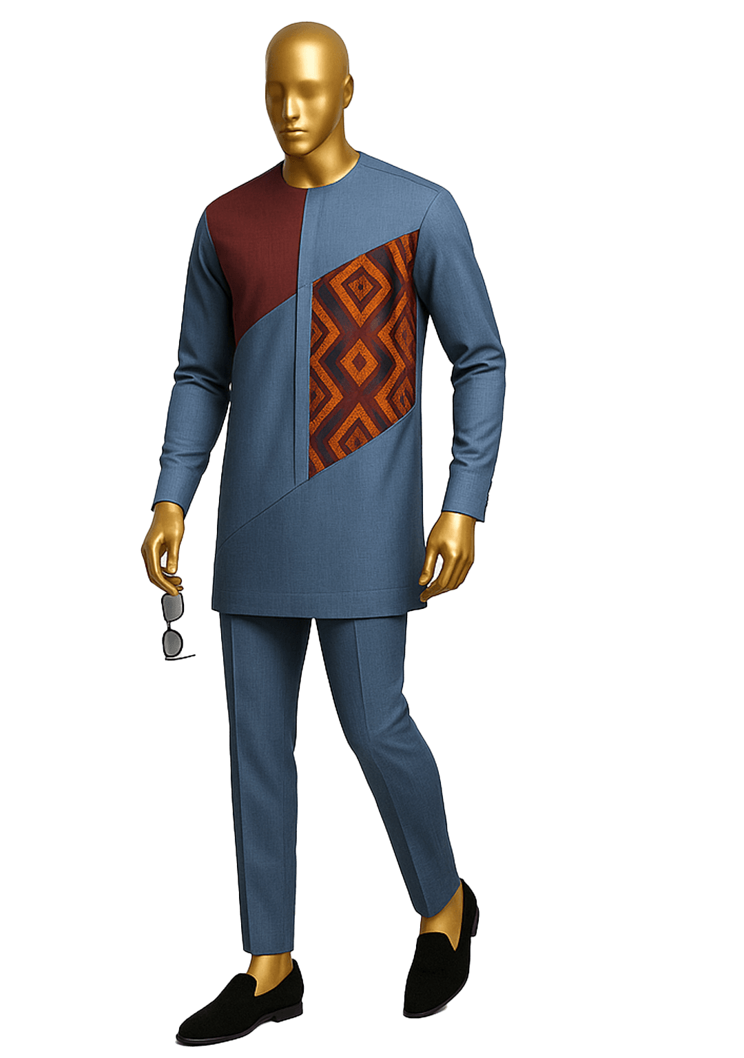 Break style boundaries with this contemporary denim blue Senator ensemble featuring bold color blocking and striking geometric embroidery. This fashion-forward two-piece set fuses traditional Nigerian tailoring with modern design aesthetics, perfect for the trendsetting gentleman who embraces innovation and artistic expression.This unique outfit showcases a long-sleeved Senator top in soft denim blue fabric, elevated by dramatic color blocking with burgundy and rust-orange panels across the chest and shoulder. The rust-orange section features eye-catching geometric diamond embroidery that adds texture and cultural authenticity to the contemporary design. The asymmetric color placement creates dynamic visual interest and modern edge. Paired with matching denim blue straight-leg trousers, this two-piece ensemble delivers bold style for fashion-forward weddings, contemporary cultural events, creative industry gatherings, artistic celebrations, and occasions where you want to make a distinctive statement. Custom-tailored to your exact measurements for impeccable fit and comfort.