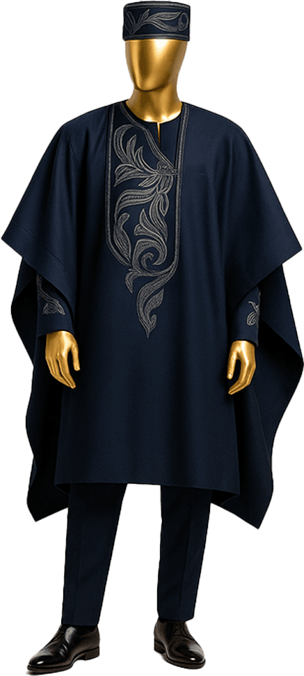 Sophisticated deep navy blue flowing agbada set featuring stunning silver embroidery in ornate swirling patterns. The voluminous outer robe creates dramatic movement with its wide, billowing sleeves and generous drape. Intricate silver threadwork adorns the chest and sleeve cuffs with flowing, artistic motifs that catch light beautifully. Paired with coordinating navy trousers and matching traditional cap. Made from premium solid fabric that drapes luxuriously. The monochromatic palette with metallic accents creates an understated yet commanding presence. Ideal for high-profile events, leadership occasions, milestone celebrations, or making a powerful statement.