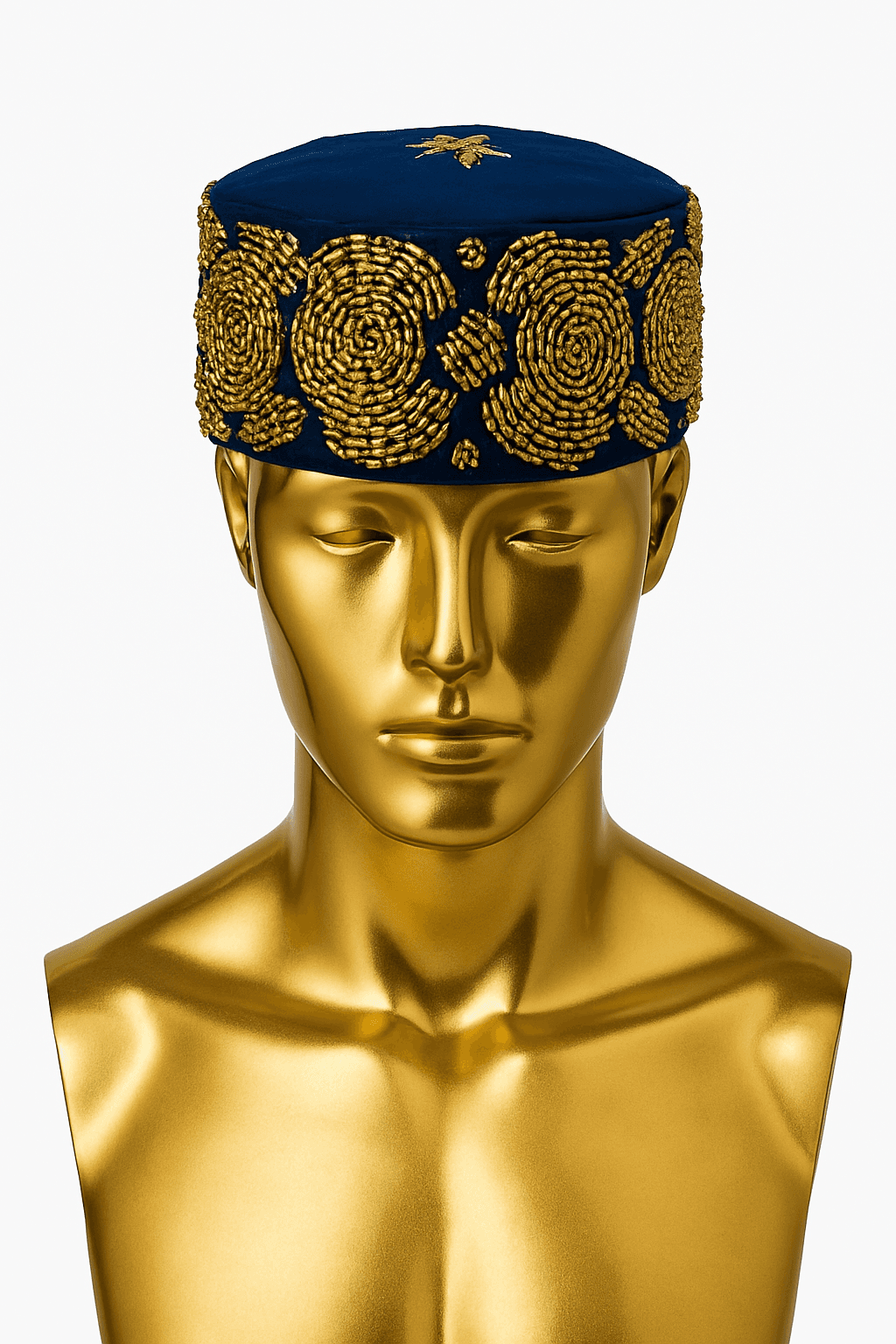 Elevate your traditional style with this magnificent navy blue Kufi cap featuring stunning gold spiral embroidery and animal motifs. This premium handcrafted accessory combines regal colors with intricate detailing, perfect for the distinguished gentleman who appreciates bold embellishments and cultural symbolism. This beautifully crafted cap showcases rich navy blue fabric with elaborate gold embroidered designs running around the entire band. The intricate pattern features mesmerizing concentric spiral circles that create hypnotic visual movement, connected by decorative elements and animal motifs including what appears to be a bird on top. The raised gold threadwork creates three-dimensional texture that catches light beautifully, adding luxury and presence. The spiral patterns symbolize journey, continuity, and eternal growth in many cultures. The cylindrical Kufi construction maintains classic proportions while the navy and gold color combination creates timeless elegance. Perfect for weddings, formal ceremonies, cultural celebrations, chieftaincy events, and prestigious gatherings where exceptional style is required. One size fits most with structured interior for comfortable all-day wear.