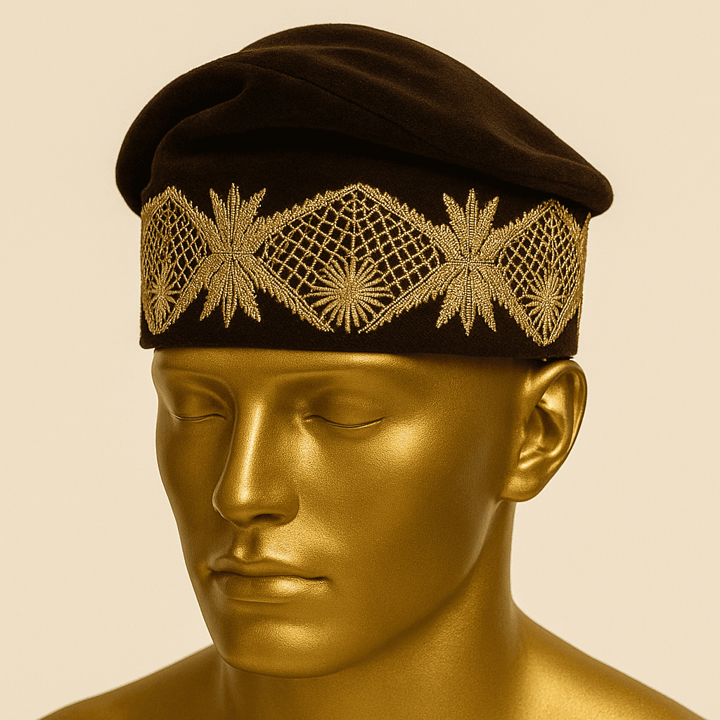 Elevate your traditional look to royal status with this luxurious chocolate brown velvet cap featuring magnificent gold embroidered band. This opulent ceremonial headpiece embodies regal elegance and cultural prestige, designed for chiefs, grooms, and distinguished gentlemen at life's most significant moments. This exceptional cap showcases rich chocolate brown velvet on top with an elaborate gold embroidered band featuring ornate geometric patterns, lattice work, and starburst motifs. The intricate embroidery creates a crown-like effect with palm leaf and diamond designs that symbolize nobility, prosperity, and honor. The plush velvet construction provides luxurious comfort while the structured embroidered band maintains impressive presence. Perfect for chieftaincy installations, royal weddings, coronations, title-taking ceremonies, and the most prestigious traditional events. The combination of deep brown velvet and metallic gold embroidery photographs beautifully and commands respect. One size fits most with adjustable interior for secure fit.