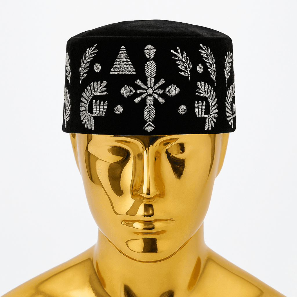 Crown your traditional look with this exquisite black velvet Kufi cap featuring stunning silver embroidered botanical and geometric motifs. This premium handcrafted accessory represents the pinnacle of traditional Nigerian headwear artistry, designed for the gentleman who appreciates luxurious details and symbolic embellishments. This beautifully crafted cap showcases rich black velvet with elaborate silver embroidered designs running around the entire band. The intricate pattern features palm fronds, wheat stalks, pyramids, stars, and geometric crosses that create a regal, almost ceremonial aesthetic. The botanical elements symbolize growth and prosperity while the geometric patterns represent cultural heritage and spiritual significance. The plush velvet construction provides luxurious comfort while the cylindrical Kufi shape maintains classic proportions. This is more than a cap—it's a statement piece that elevates any traditional ensemble from elegant to extraordinary. Perfect for weddings, chieftaincy ceremonies, religious celebrations, formal cultural events, and prestigious gatherings where you want to make a distinguished impression. One size fits most with structured interior for comfortable, secure fit.