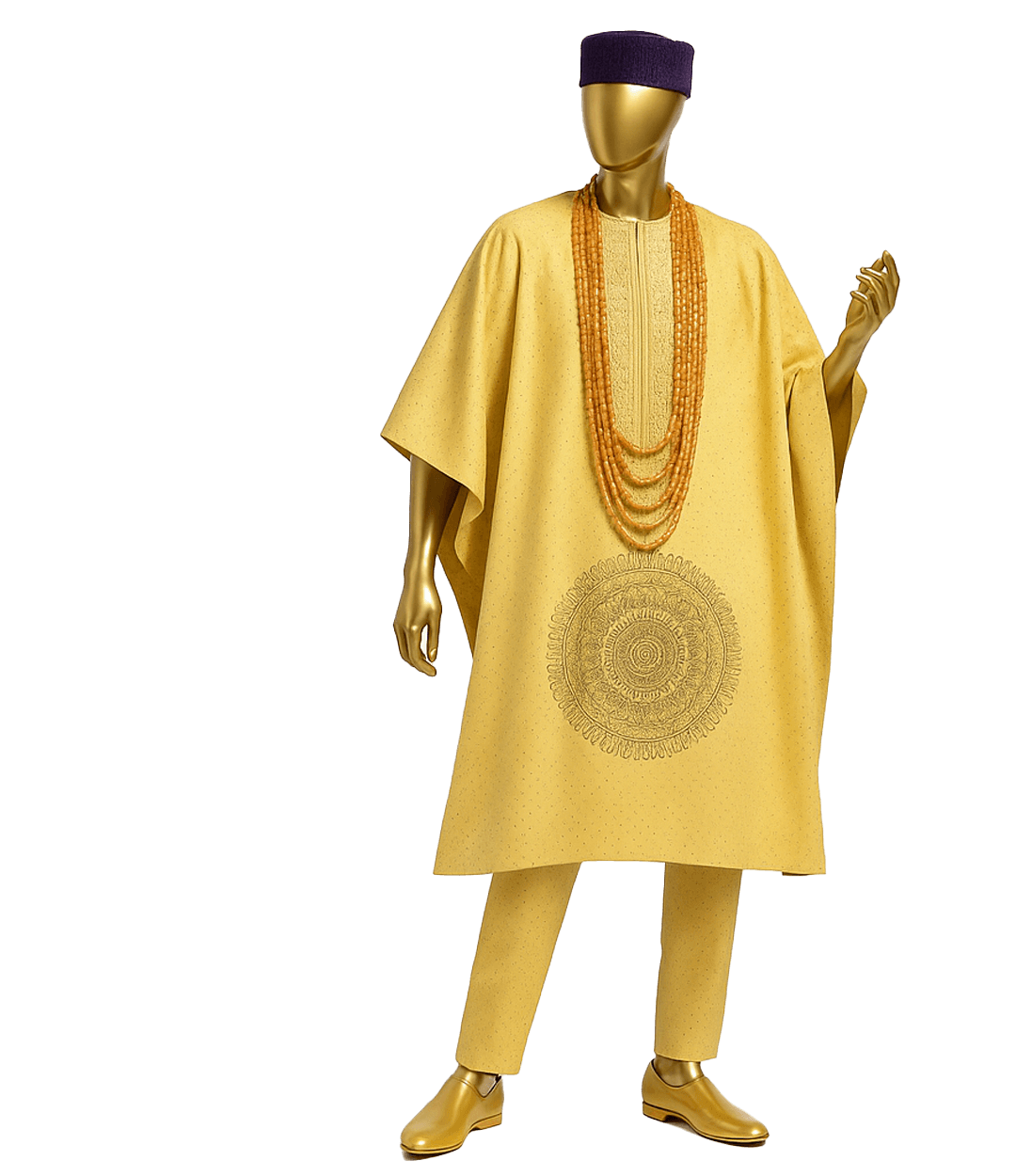 Radiate luminous elegance with this spectacular golden yellow Agbada featuring intricate tonal mandala embroidery. This luxurious four-piece set embodies prosperity and celebration, perfect for the gentleman who embraces vibrant color and symbolic patterns. This dazzling outfit showcases a short-sleeved Agbada in brilliant golden yellow fabric, adorned with stunning tonal yellow embroidered mandala design creating a mesmerizing circular pattern on the lower chest, symbolizing wholeness, unity, and spiritual journey. Styled with orange coral beaded necklaces that add traditional cultural authenticity and visual richness. The traditional wide-sleeve design creates regal presence. Complete with matching golden yellow trousers, inner long-sleeved top, and a coordinating purple Kufi cap for sophisticated color contrast, this complete ensemble delivers joyful sophistication for celebrations, cultural festivals, spring weddings, milestone events, and occasions requiring radiant, optimistic style. The golden yellow symbolizes prosperity, joy, and new beginnings. Custom-tailored to your exact measurements.