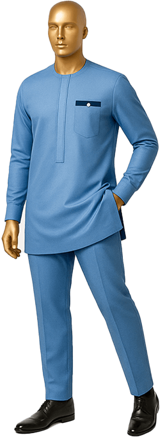 Sleek contemporary sky blue senator suit in premium solid fabric with refined minimalist design. Features mandarin collar, subtle chest pocket accent in contrasting navy detail, and a modern fitted silhouette that bridges traditional and contemporary style. The long-sleeved top pairs perfectly with matching straight-leg trousers for a complete, polished look. This outfit is effortlessly sophisticated without being overwhelming. The calming azure blue offers a fresh take on Nigerian menswear while maintaining cultural authenticity. Perfect for the modern man who appreciates tradition with a contemporary edge. Ideal for church services, cultural events, business meetings, upscale gatherings, or any occasion where you want to look sharp and culturally connected.