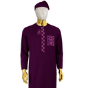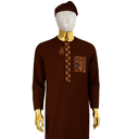 Make a sophisticated statement with this elegant black Kaftan ensemble featuring luxurious brocade accent panels and contemporary styling. This refined two-piece set combines monochromatic elegance with textured details, perfect for the fashion-forward gentleman who appreciates subtle luxury and modern edge.This striking outfit showcases a long-sleeved Kaftan in deep black fabric, elevated by eye-catching gold and blue brocade accent panels on the chest placket and pocket. The ornate brocade features traditional damask patterns that add richness and visual interest to the minimalist black base. The round neckline with geometric brocade trim creates contemporary framing. Paired with matching black straight-leg trousers, this two-piece ensemble delivers sophisticated style for upscale evening events, fashion-forward gatherings, contemporary cultural celebrations, and occasions requiring modern elegance with traditional roots. The black base with luxe accents makes this incredibly versatile. Custom-tailored to your exact measurements for impeccable fit.