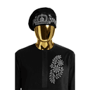 This stunning deep burgundy velvet ensemble features a coordinating embroidered cap and tunic in matching fabric. The cap showcases elaborate golden embroidery including crown motifs and botanical patterns across the entire surface. The long-sleeved tunic displays golden leaf embroidery on the chest pocket area, creating a cohesive look. The rich burgundy velvet offers luxurious texture while the golden threadwork adds visual interest and elegance. Pair this set with burgundy or black trousers for formal occasions. The velvet fabric drapes beautifully and photographs exceptionally well, making it ideal for special events and celebrations. The matching cap and tunic create a polished, intentional presentation.