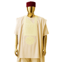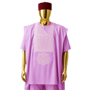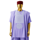 This soft lavender short-sleeved Agbada showcases intricate white embroidery featuring geometric patterns and knotwork down the chest. The pastel purple fabric creates gentle, approachable presentation while the detailed white needlework adds dimension. Complete with burgundy cap for striking color contrast, this ensemble balances soft and bold tones. The flowing silhouette offers comfort while maintaining refined appearance. The lavender and burgundy combination creates unexpected yet sophisticated color pairing. Pair with white or black trousers for versatile styling options.