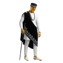 Celebrate Igbo cultural excellence with this distinguished ensemble featuring a crisp white tunic paired with a luxurious navy blue wrapper adorned with golden embroidered borders. The wrapper drapes elegantly across the shoulder and torso, showcasing intricate golden botanical patterns along its edges that speak to craftsmanship and heritage. Complete with matching navy cap embellished with golden detailing, coral beads, and ceremonial walking staff, this set represents the pinnacle of Eastern Nigerian traditional sophistication. Perfect for cultural ceremonies, title-taking events, and prestigious gatherings where honoring Igbo heritage matters. The contrast between pristine white and deep navy creates visual drama, while the golden embroidery adds royal distinction. This ensemble commands respect and admiration at any traditional function. Pair with white leather footwear to maintain the elegant color story.