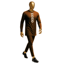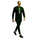 This sleek all-black long-sleeved tunic features bold white leaf or chevron embroidery pattern down the center chest. The contemporary graphic design creates striking contrast against the black fabric. Paired with matching black trousers for streamlined two-piece presentation. The modern embroidery pattern offers fresh take on traditional styling. The fitted long-sleeved silhouette creates clean, polished look perfect for urban professionals. The black and white palette ensures versatile styling across occasions.