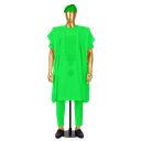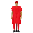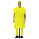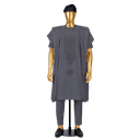 This pristine all-white short-sleeved Agbada features geometric white-on-white embroidery panel with knotwork details down the chest. The flowing outer robe creates commanding presence while the tonal embroidery adds subtle sophistication. Complete with pale grey cap for soft contrast and matching white trousers. The head-to-toe white presentation offers timeless ceremonial elegance. The textured embroidery provides visual interest through dimensionality rather than color. Ideal for milestone celebrations where pristine presentation matters most.