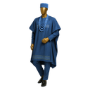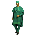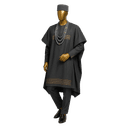 Rich burgundy wine-colored Agbada in luxurious fabric with subtle golden embroidered bands at chest pocket and hem. The short-sleeved flowing outer robe creates regal silhouette. Complete with matching burgundy cap, multiple strands of coral beads, and burgundy trousers for head-to-toe coordination. The deep burgundy offers sophisticated alternative to black or navy. Golden embroidery bands provide just enough embellishment without overwhelming the rich base color. This is understated luxury that lets quality fabric and expert tailoring speak volumes.