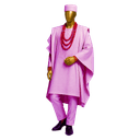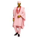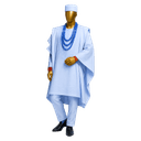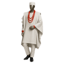 Luxurious cream-colored flowing Agbada with short sleeves draped over matching inner tunic. Features subtle tonal embroidery panel down the chest creating understated elegance. The ensemble includes cream cap and multiple strands of coral red beads with matching bracelet for a complete ceremonial look. The soft cream palette photographs beautifully and works across seasons. This three-piece set delivers traditional grandeur with the dramatic draping outer robe creating instant presence. Add your choice of staff or fan to personalize the presentation.