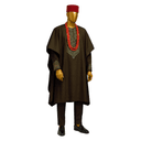 Deep forest green short-sleeved Agbada featuring elaborate golden embroidered chest panel with intricate geometric designs. The flowing outer robe pairs over long-sleeved inner tunic with matching golden cuff embroidery. Includes red cap for striking color contrast and strands of coral beads. Complete with matching green trousers. Bold color choice for the confident dresser. The forest green and gold combination creates luxurious visual richness while the coral accessories add unexpected pop. This three-piece ensemble makes memorable impression at any celebration.