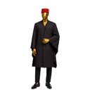 Deep navy blue flowing Agbada with subtle lapel detail and clean lines throughout. The short-sleeved outer robe drapes dramatically while maintaining refined sophistication. Minimal embellishment allows the luxurious navy fabric to take center stage. Complete with red cap for striking contrast and matching navy trousers. The lapel detail adds contemporary tailoring element to traditional silhouette. Navy offers timeless versatility—equally appropriate for evening galas or daytime celebrations. The flowing cut provides comfort and presence without fussy details. Add coral beads for traditional styling or keep accessories minimal for modern interpretation.