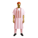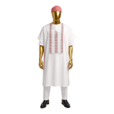 Pristine white senator ensemble featuring exquisite gold embroidery in traditional geometric patterns down the chest panel. Crafted in premium solid white fabric with short sleeves, round neckline, and impeccable tailoring. Complete with matching white cap and coordinating trousers for a full distinguished look. This is timeless elegance at its purest. The crisp white base creates a clean canvas that lets the intricate gold embroidery shine as the centerpiece. The combination of pure white and rich gold threadwork symbolizes prestige and cultural pride. Perfect for white weddings, church dedications, chieftaincy installations, naming ceremonies, or any sacred celebration where you want to embody dignity and tradition.