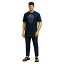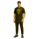Modern black short-sleeved dashiki with striking golden geometric embroidery on the chest. Premium cotton-blend fabric offers comfortable everyday wear with cultural flair. The minimalist design features clean lines and subtle ornamentation. Includes matching black cap and sokoto for a complete casual-traditional look. This bridges the gap between streetwear and tradition—perfect for the modern African man. The understated golden embroidery adds cultural identity without being formal. Comfortable enough for daily wear yet respectful enough for casual traditional occasions. Ideal for weekend gatherings, casual family events, community functions, cultural meet-ups, or everyday heritage wear.
