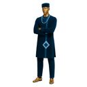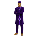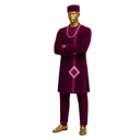 Magnificent deep burgundy long-sleeved native wear featuring bold gold and red diamond emblem on chest and asymmetric side panel. Premium solid fabric with striking geometric embroidery creating visual impact. Complete with matching embroidered fila and multi-strand coral beads. Includes coordinating sokoto. The dramatic insignia pattern symbolizes heritage, identity, and distinction. This is for men who carry themselves like royalty because they understand their cultural worth. The asymmetric design adds contemporary edge to traditional prestige. Perfect for chieftaincy events, high-profile weddings, cultural leadership occasions, prestigious ceremonies, or anytime you embody authority and tradition.