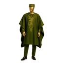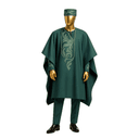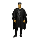 Sophisticated deep navy blue flowing agbada set featuring stunning silver embroidery in ornate swirling patterns. The voluminous outer robe creates dramatic movement with its wide, billowing sleeves and generous drape. Intricate silver threadwork adorns the chest and sleeve cuffs with flowing, artistic motifs that catch light beautifully. Paired with coordinating navy trousers and matching traditional cap. Made from premium solid fabric that drapes luxuriously. The monochromatic palette with metallic accents creates an understated yet commanding presence. Ideal for high-profile events, leadership occasions, milestone celebrations, or making a powerful statement.
