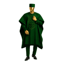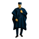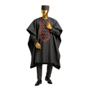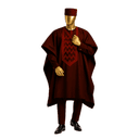 Striking black complete agbada ensemble featuring bold burgundy chevron embroidery cascading down the chest. The flowing outer robe drapes dramatically with wide sleeves, creating impressive silhouette and movement. Intricate zigzag embroidery in deep red tones creates stunning contrast against the rich black fabric. Paired with coordinating black trousers and matching traditional cap. Made from premium quality solid fabric with meticulous threadwork detailing. The geometric pattern adds contemporary flair while maintaining traditional sophistication. Perfect for formal events, cultural celebrations, distinguished gatherings, weddings, or making a powerful statement.