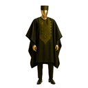 Rich brown complete agbada set showcasing earth-toned elegance with intricate golden-brown embroidery. The voluminous flowing outer robe features generous drape and wide sleeves for commanding presence. Detailed geometric embroidery adorns the chest in warm tones, creating beautiful tonal contrast against the chocolate brown base. Inner kaftan and coordinating trousers complete the refined ensemble. Includes matching brown traditional cap with subtle embellishment. Crafted from premium solid fabric with expert embroidery work. The monochromatic palette exudes understated luxury and timeless appeal. Ideal for upscale occasions, cultural leadership events, dignified ceremonies, or sophisticated celebrations.