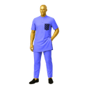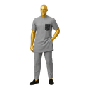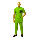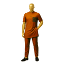 Vibrant golden mustard short-sleeved senator ensemble with eye-catching embroidered chest pocket. The relaxed fit top features classic button placket and mandarin collar for contemporary styling. Standout geometric lattice embroidery adorns the chest pocket in rich brown tones creating textural contrast. Paired with coordinating mustard trousers for complete tonal harmony. Crafted from quality solid fabric with expert embellishment detailing. The warm golden hue radiates confidence and modern energy. Clean lines and minimal design keep the look fresh and sophisticated. Perfect for daytime events, casual celebrations, weekend gatherings, or adding contemporary flair to traditional styling.